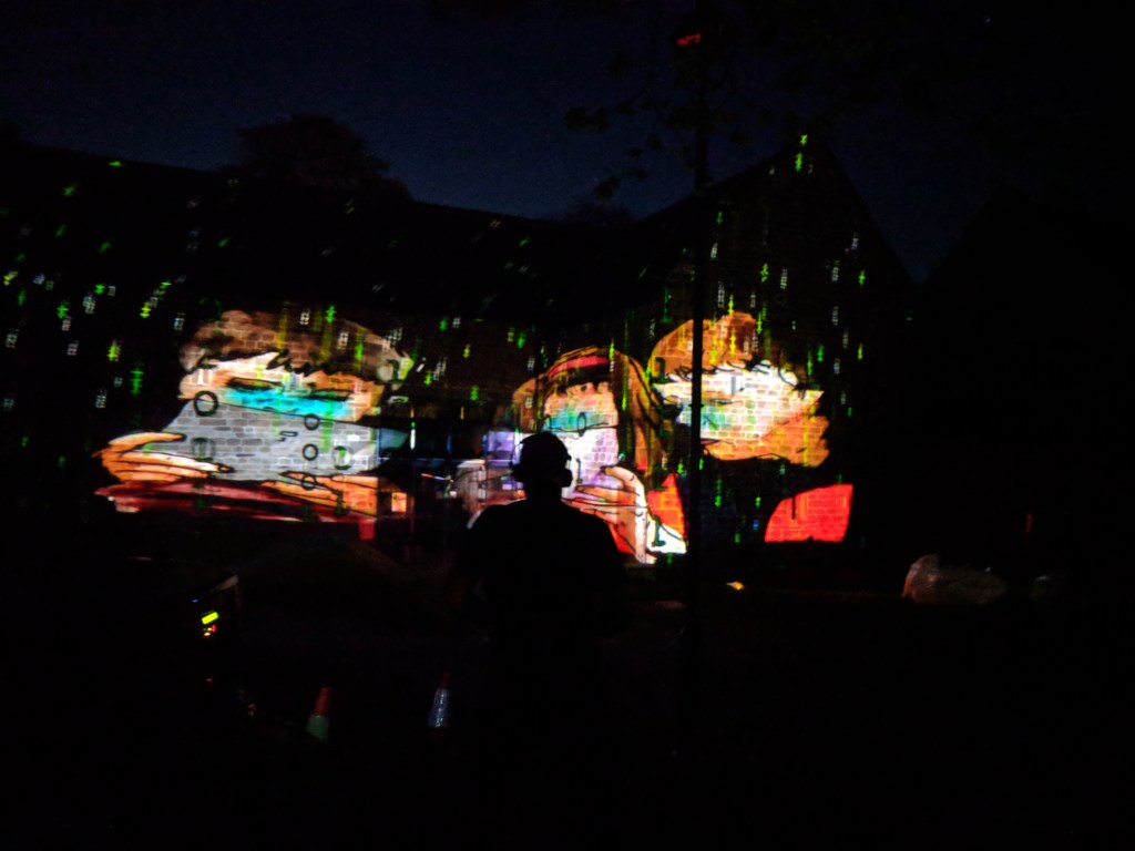 Projecting on to Phlegm’s amazing Street art at Kelham Island, using an Epson projector coupled to a Lightform spatial analyser and a small generator for power. It was quite late at night but still had a few people pass by who were very enthusiastic about the event.