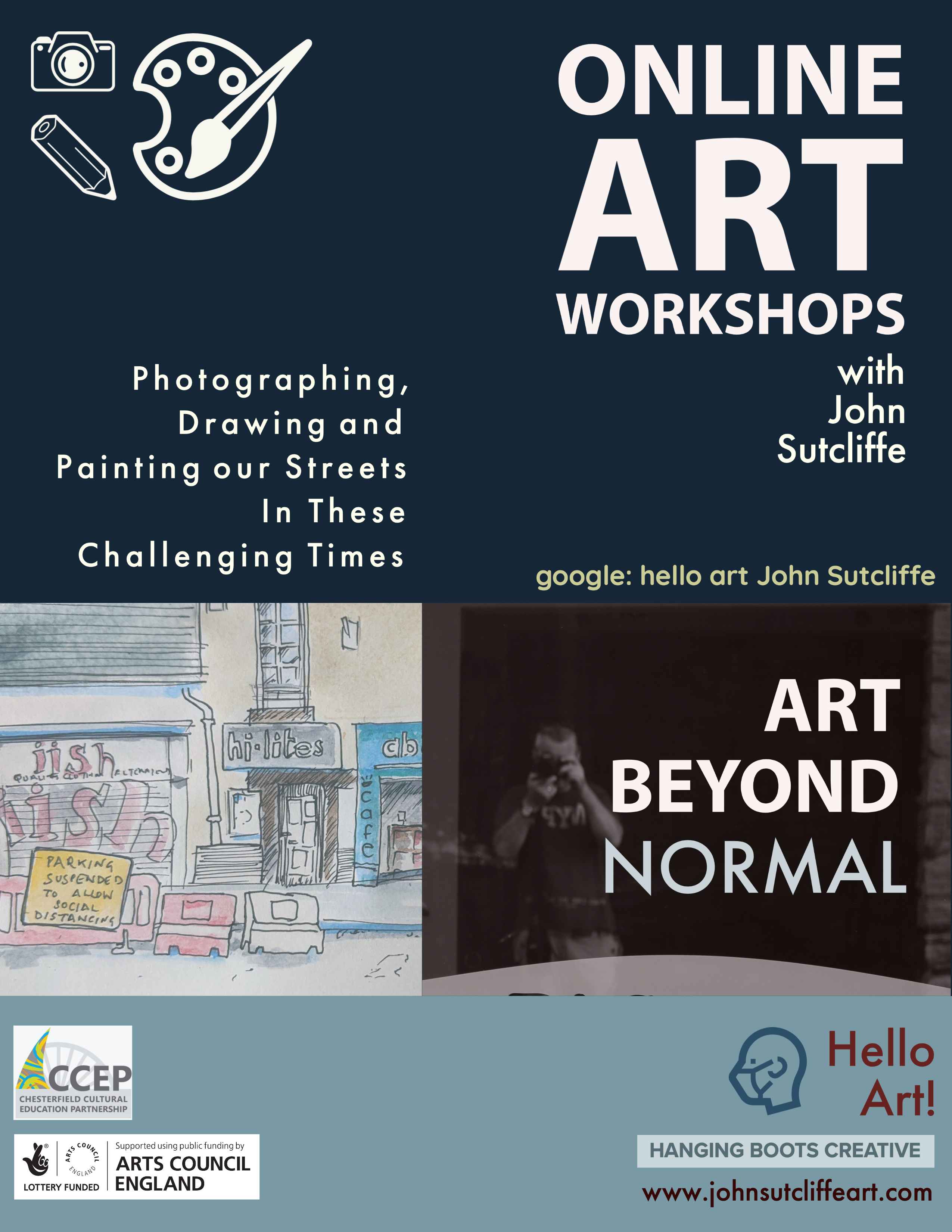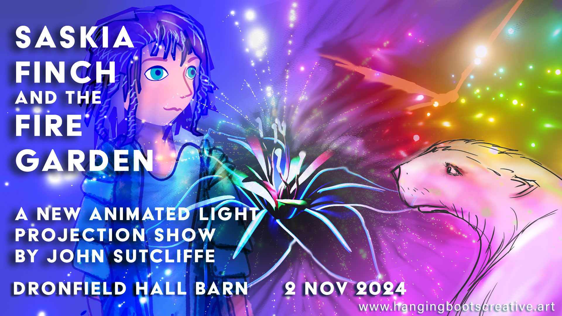 John Sutcliffe of HangingBootsCreative is an innovative and award winning visual arts specialist, using traditional art materials, digital illustration and augmented reality technologies to tell stories, create paintings and contemporary art and create learning experiences in collaboration with the local community and the other artists. A former teacher, John is known for his use of light technology as a medium for art, creating digitally projected installations and animations (as artist in Residence) for Dronfield Hall Barn and the Dronfield Arts Festival, and community arts classes in drawing, painting, printmaking and sculpture. He is also known for his photographic installations, paintings of Derbyshire and animal prints. He is the creative lead for the Dronfield Lantern Parades.