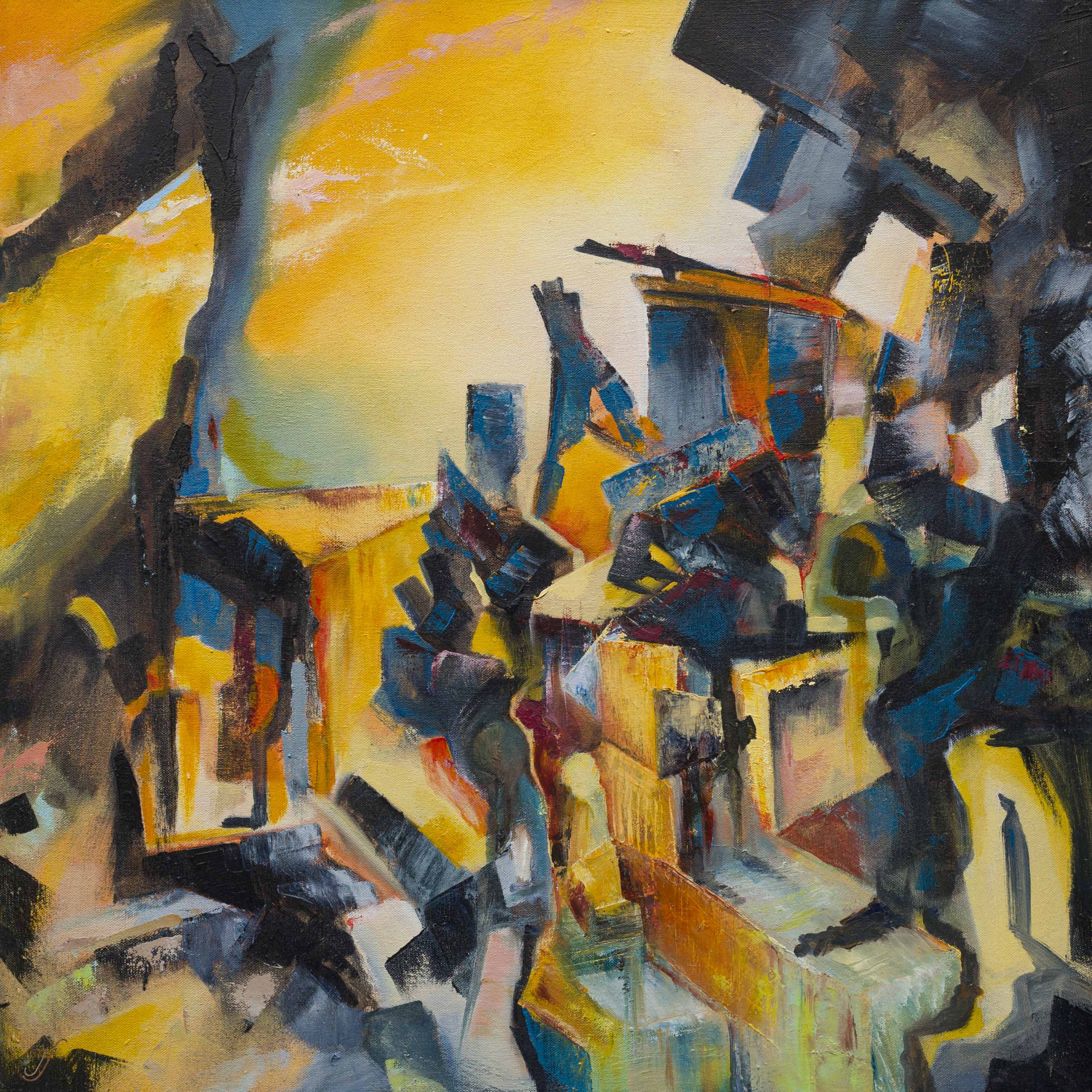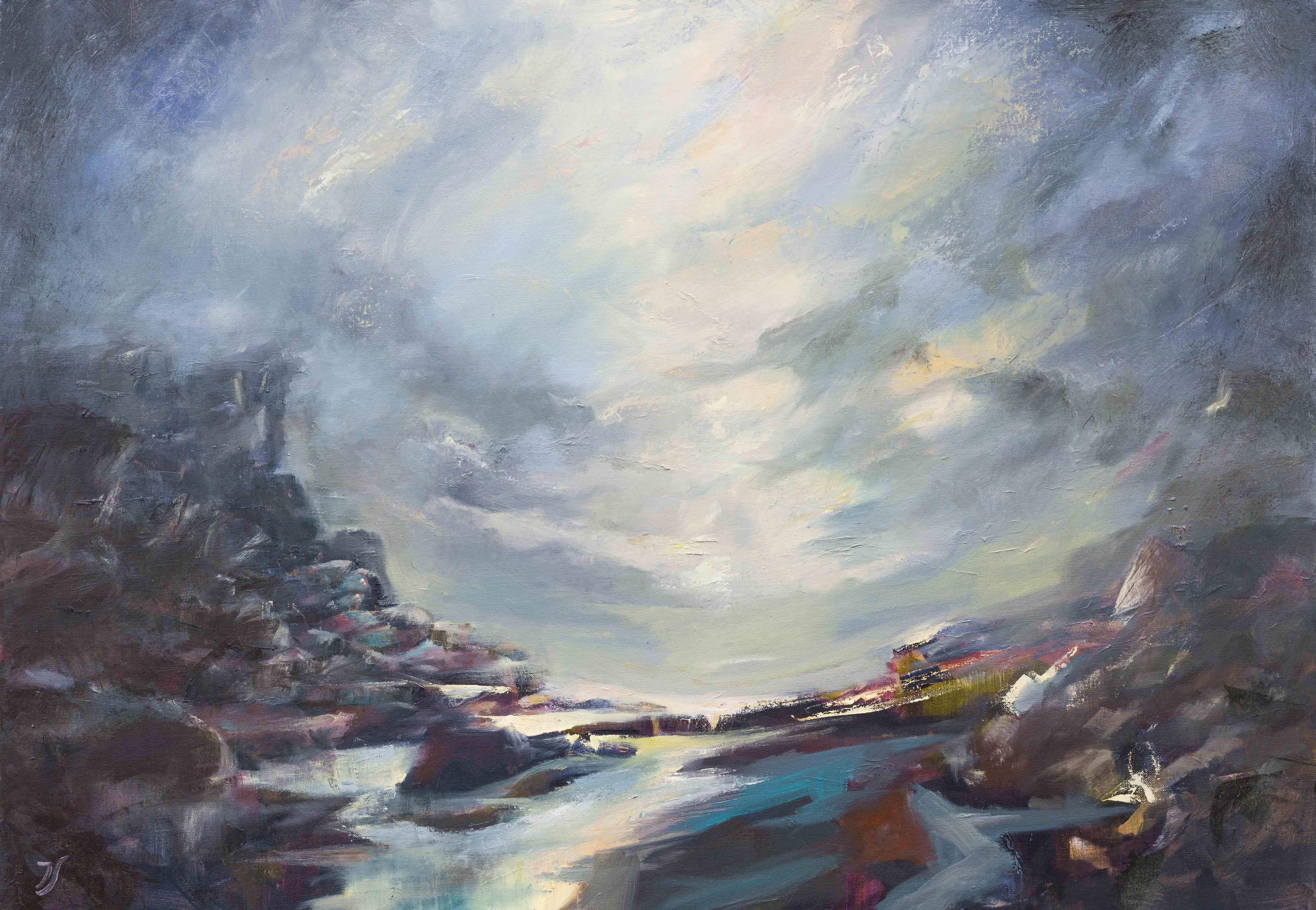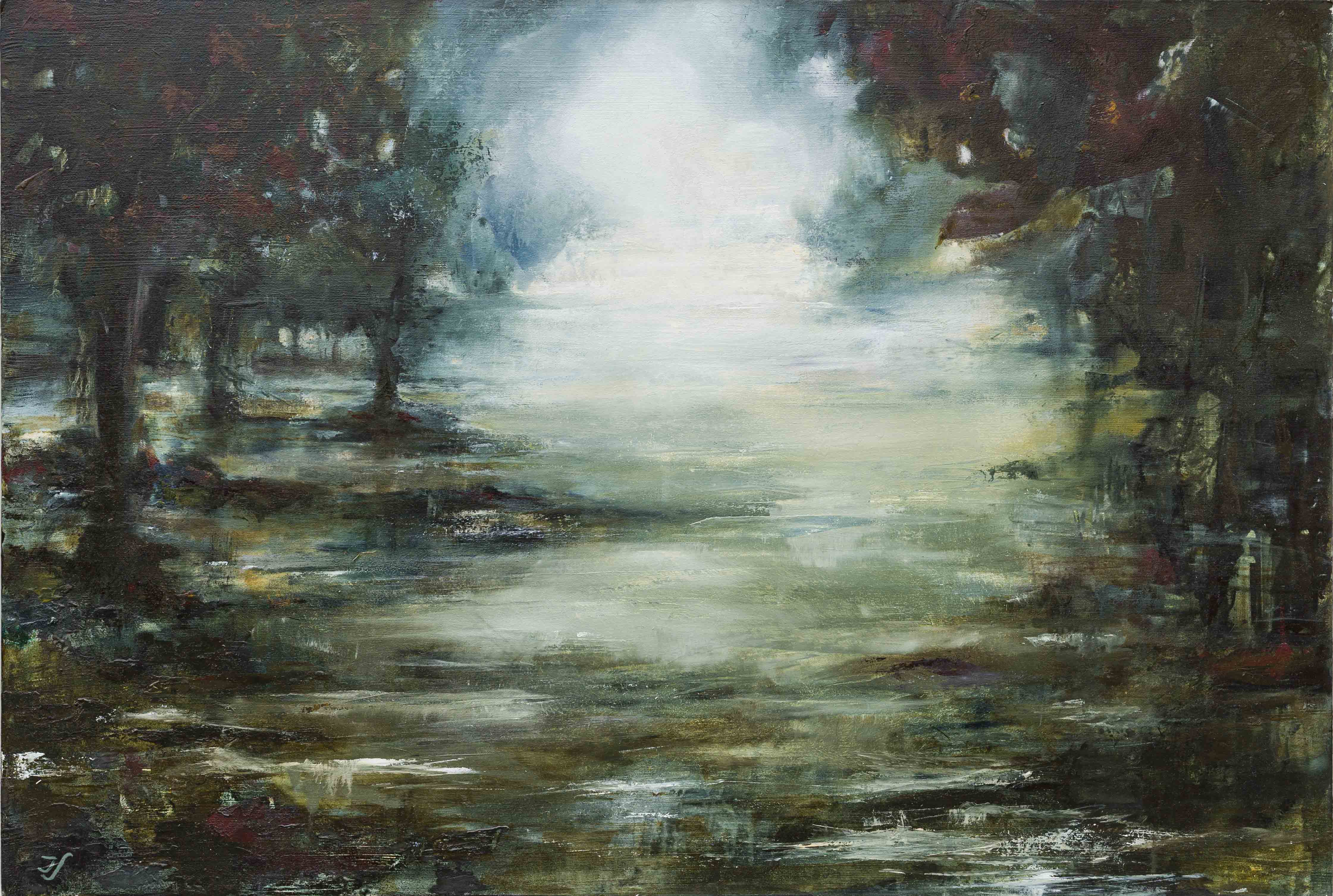 Land and Myth explores the connections between the land, the water and the air and our uniquely human desire to create stories. I like to imagine that the spaces I create ask the viewer ‘what could have happened here’. These abstracted landscapes are often inspired by real places which are then reshaped with a process of dripping and scraping oils, layering materials and creating new vistas and atmospheres in which one can continually wander and wonder.